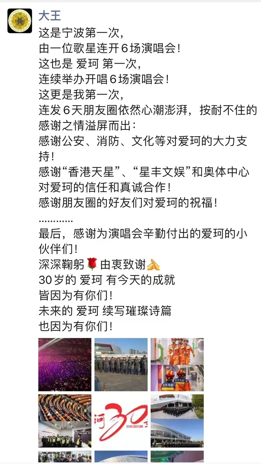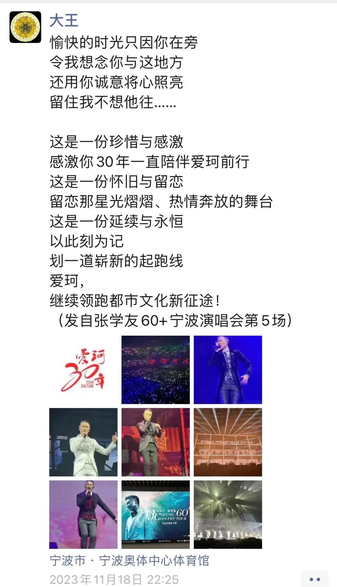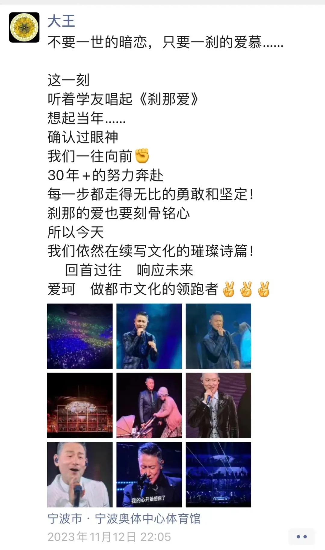诞生于1993年的爱珂文化集团,今年也迎来了30周年的喜悦时刻。爱珂曾多次举办张学友在宁波的大型演出,结下了深厚的渊源。30周年举办张学友60+巡回演唱会,更是源于爱珂与歌神深厚友情的动人之作。爱珂掌舵人抑制不住汹涌澎湃的心情,连发6天朋友圈,每天从歌单中选择一首歌的歌词作为切入点,抒发了自己对文化执着的情怀。同为经典,强强联手,一个时代的回响此刻发出了强音——做都市文化的领跑者。