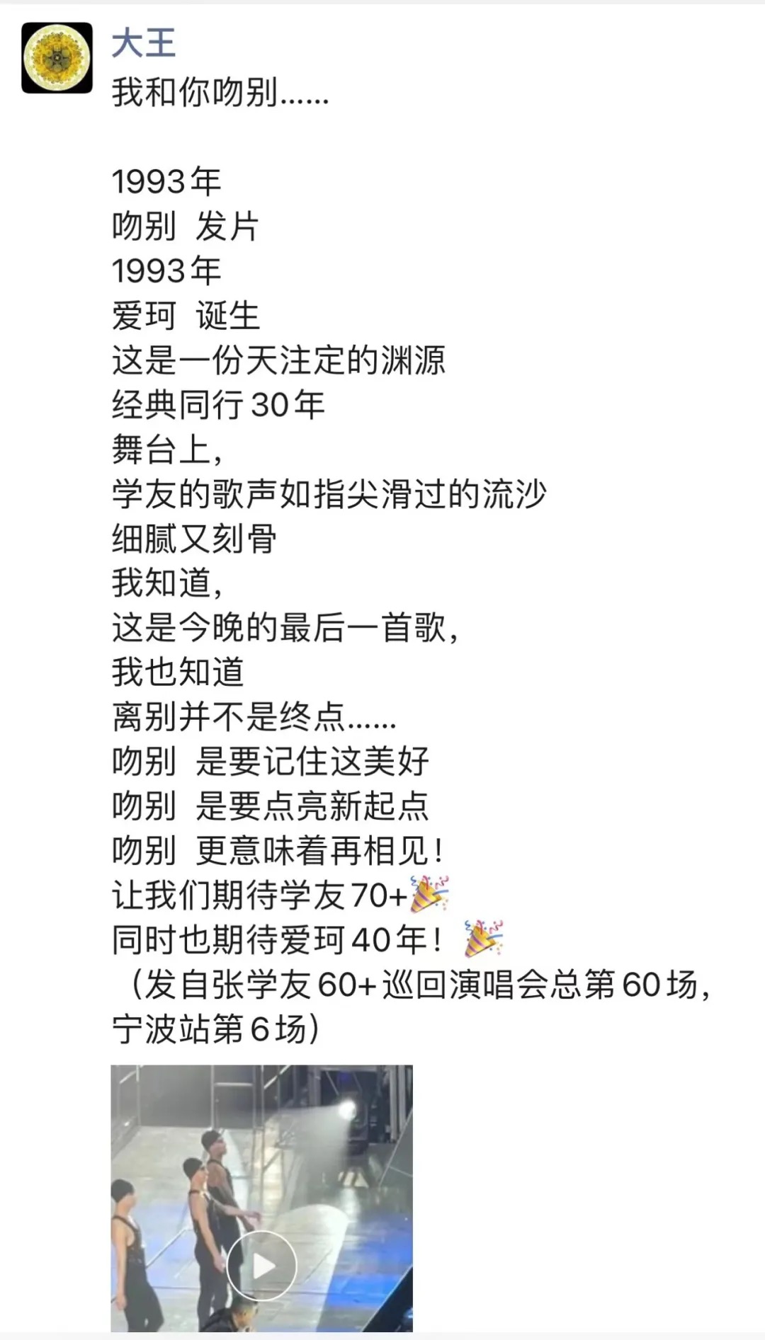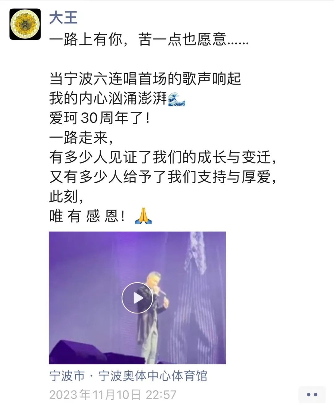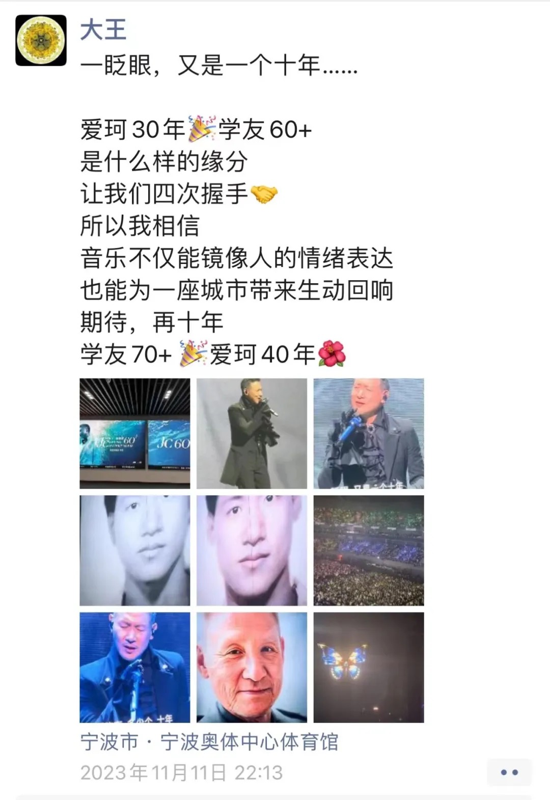 诞生于1993年的爱珂文化集团,今年也迎来了30周年的喜悦时刻。爱珂曾多次举办张学友在宁波的大型演出,结下了深厚的渊源。30周年举办张学友60+巡回演唱会,更是源于爱珂与歌神深厚友情的动人之作。爱珂掌舵人抑制不住汹涌澎湃的心情,连发6天朋友圈,每天从歌单中选择一首歌的歌词作为切入点,抒发了自己对文化执着的情怀。同为经典,强强联手,一个时代的回响此刻发出了强音——做都市文化的领跑者。