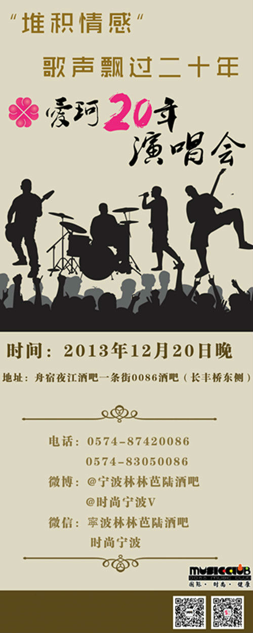 今天晚上,“堆积情感”歌声飘过二十年—爱珂20年演唱会将在0086酒吧上演。这是为庆祝爱珂20年而举办的一场特别的演唱会,届时元老级歌手将领衔原音重现0086。这是一个的爱珂追梦传奇:精彩视频、催泪故事、激情互动,每一寸舞台都燃烧着炽热的邀约!!