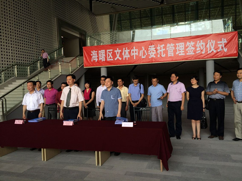 6月13日下午,海曙区政府及有关部门负责人和爱珂文化集团、富邦控股集团公司代表在新建的海曙区文体中心现场举行了简朴而隆重的签约仪式。
