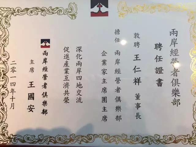 爱珂文化集团董事长王仁祥受聘为两岸经营者俱乐部企业家主席团主席。