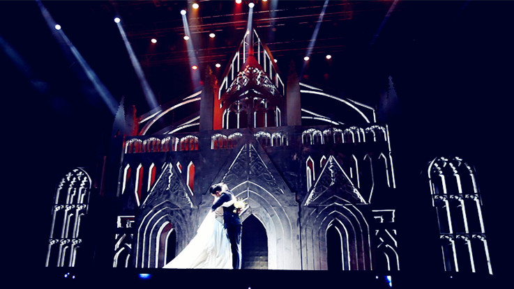 此次,蔡上以美国纽约著名哥谭宴会大厅为灵感,将华侨水晶宫打造成为最震撼的哥特式宴会空间:1000㎡高清立体LED屏幕,顶级高频环绕线阵音响,双层圆形可控升降舞台以及360°全景3D投影,将舞台剧场的专业高配元素融入婚宴大厅,这在宁波乃至浙江都是独一无二的。